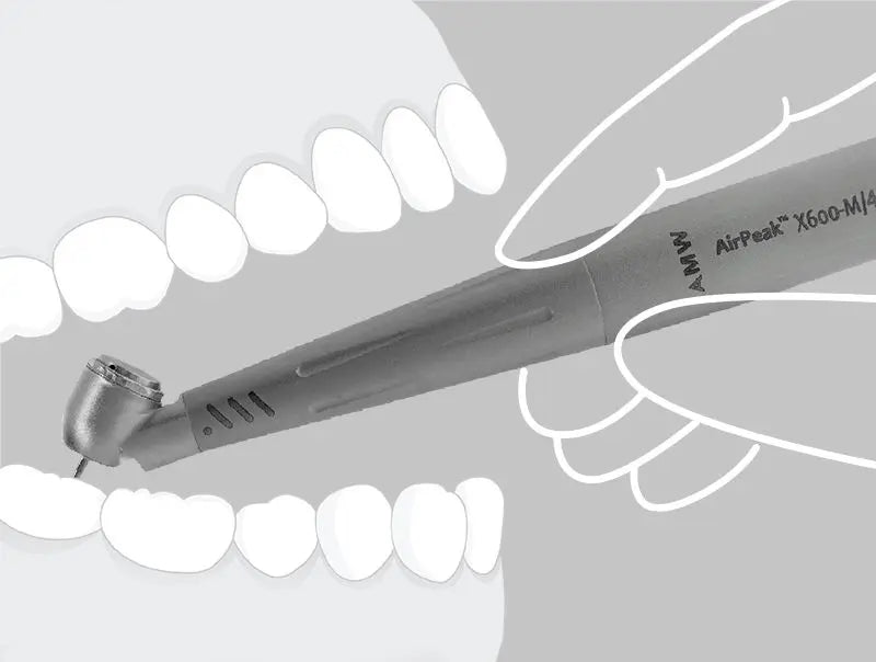 Introducing the AirPeak X600-45, an innovative groundbreaking 45-degree head design. This revolutionary device enables easy access to challenging molars that traditional handpiece struggle to reach. It not only enhances visibility but also provides exceptional maneuverability, increasing the distance between neighboring teeth and the handpiece body.