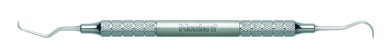 Combines a moderate size, medium-reach sickle that has a blade width of 0.9 mm that tapers to a point with a universal curette that has sharp cutting edges on both sides of the blade and a rounded toe. The Long Reach curette has a 0.8 mm blade width and a 1 mm diameter terminal shank with a 12 mm reach. Featuring our Relyant® Handle, additional handle options are shown below.