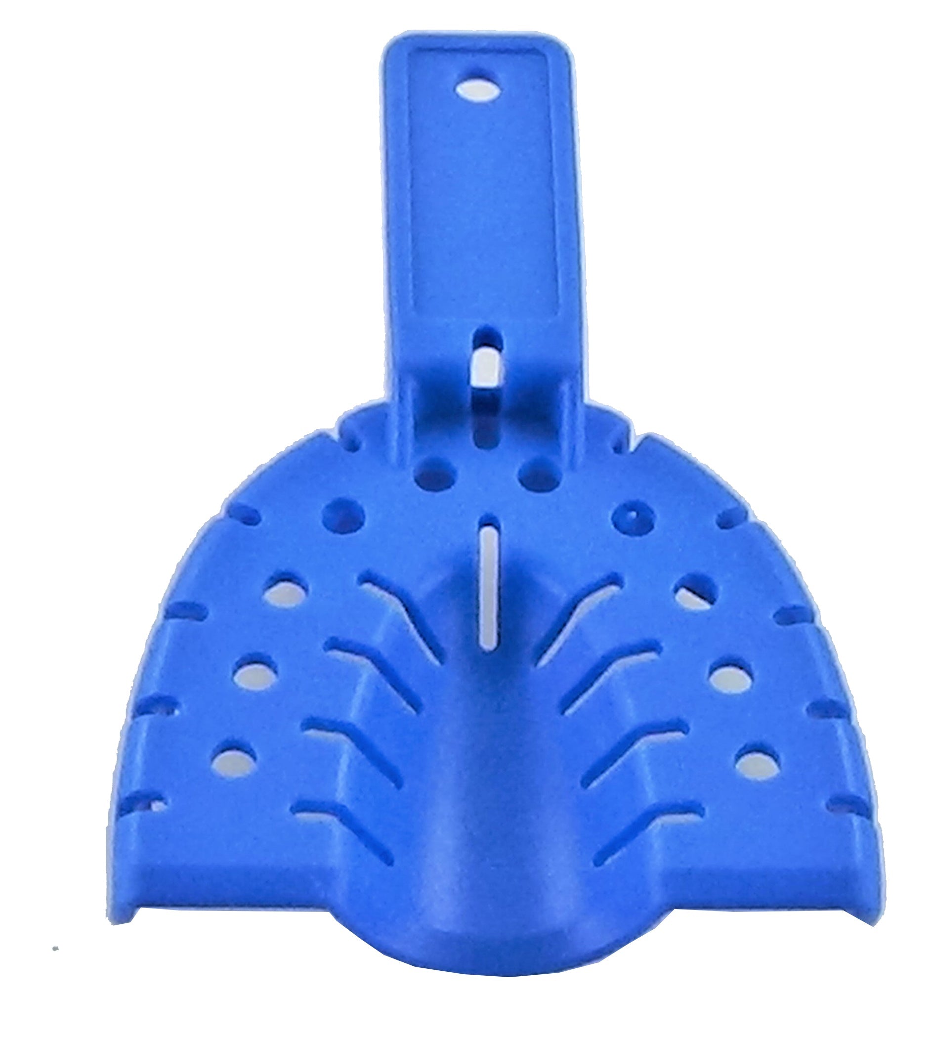 Next VPS Large Blue Upper Full-Arch Perforated Plastic disposable impression tray. Top of tray is curved for patient comfort and accurate impression. Bag of 50 trays.
