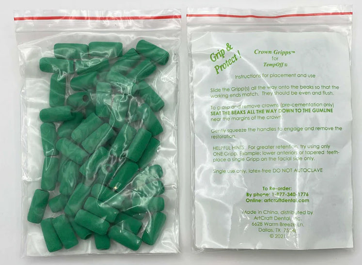 These crown grippers are designed to use with both TempOff®. The disposable pads allow easy retrieval of uncemented ceramic restorations without damage to the porcelain. Gives simple access to hard to reach posterior areas. Retrieving the restorations with Crown Gripps™ will not smudge or remove your articulating marks.