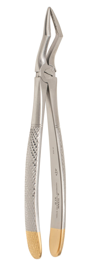 Upper Root extraction forceps has beaks that have a diamond grit coating to enhance grip and easily remove a maxillary root. The standard handle forceps has a diamond grip handle and is made in Germany from 100% stainless steel.