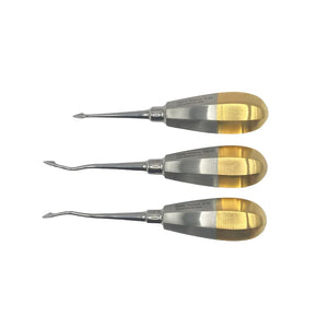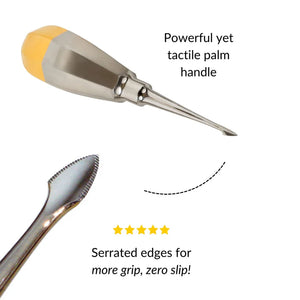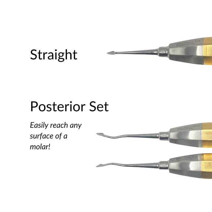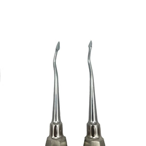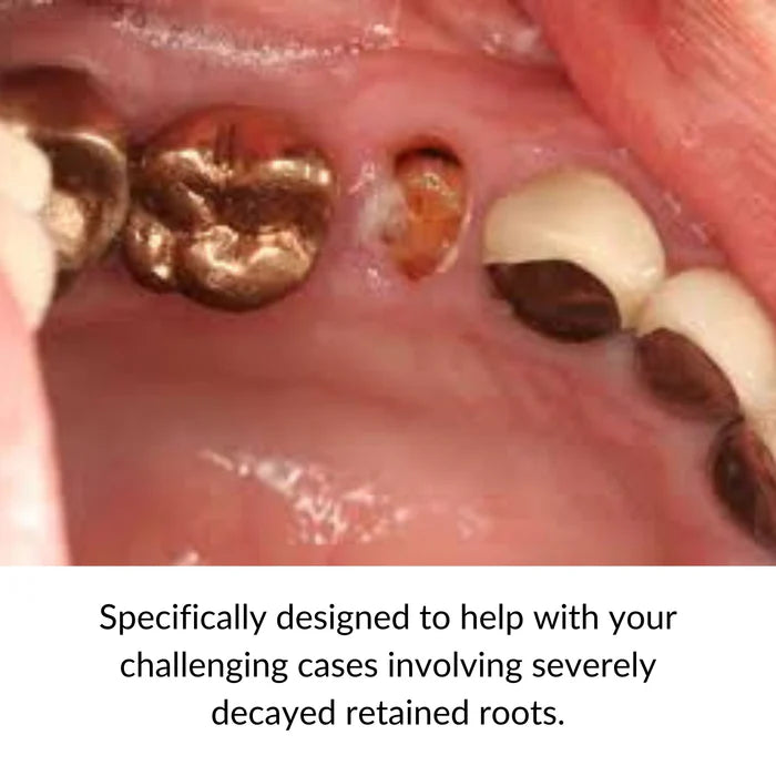 This is the go-to set for broken root tips or badly decayed retained roots. The spear elevator has an ergonomic palm handle design for more power. The smaller root tip picks allow for better access to deep, broken root tips.