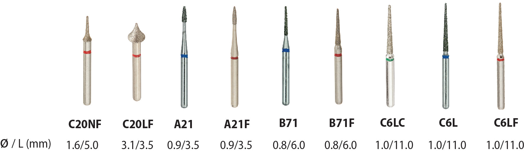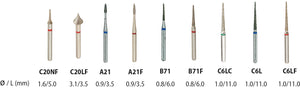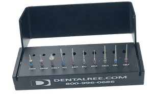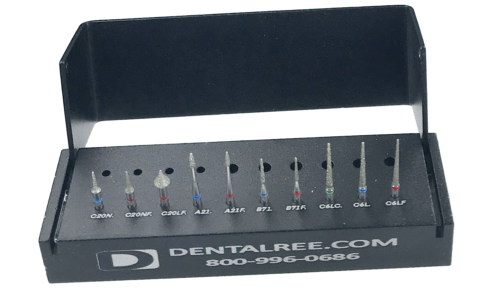 FG (high speed) rotary diamonds to assist in IPR and breaking contact in dental procedures. Medium or fine grit, thin diamonds are included in this kit.
