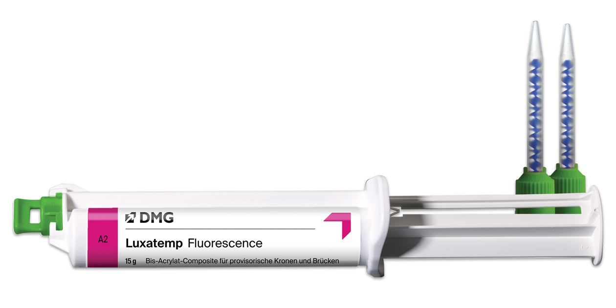 Temporary Bis-GMA C&B material containing a fluorescence agent to create a more lifelike appearance. Same great handling characteristics as Luxatemp Automix Plus.
