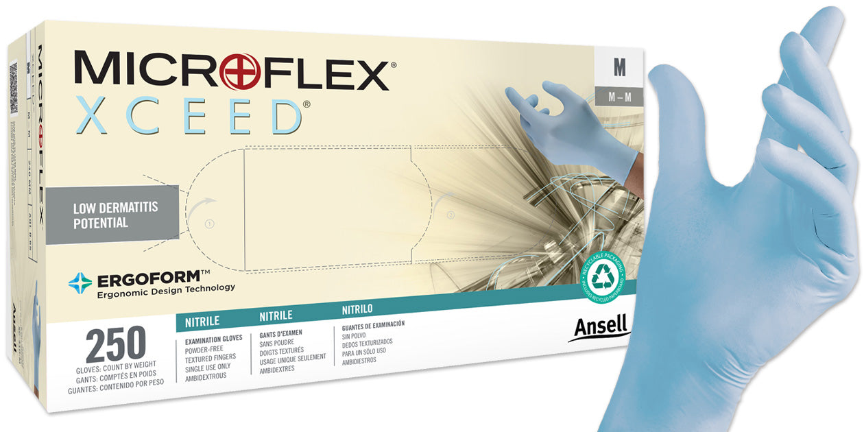 Microflex XCEED gloves are manufactured without sulfur-based chemical accelerants for low dermatitis potential and prevent instances of Type 1 latex allergies and Type IV chemical allergic reactions. Boasts stronger formulation to protect against rips and tears while keeping the same tactile sensitivity. Designed with proprietary ergonomic design technology to support musculoskeletal health and increase worker productivity. With low 0.65 AQL, these gloves offer advanced barrier integrity.