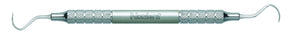 The unique bends of the N129 are easy to adapt to any area without excessive adjustments, while the long slender sickle blades allow for interproximal insertion. Mirror image blades on a medium-reach terminal shank. The blades taper to a point from a 0.8 mm width and have a reach of 10 mm. Featuring our Relyant® Handle, additional handle options are shown below.