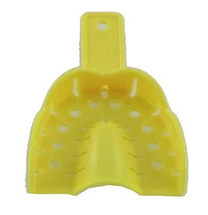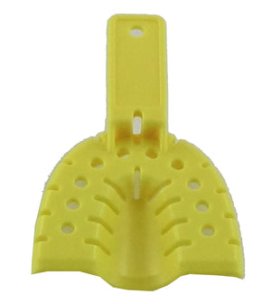 Next VPS Medium Yellow Upper Full-Arch Perforated Plastic disposable impression tray. Top of tray is curved for patient comfort and accurate impression. Bag of 50 trays.