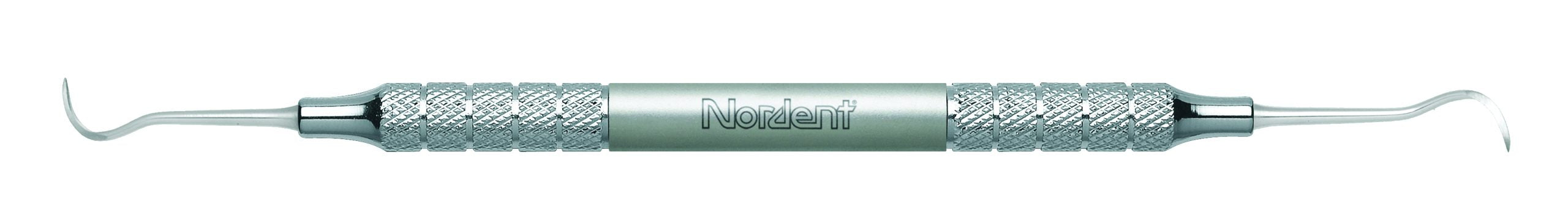 Both sickles have an identical moderate size, medium-reach length and blade widths of 0.8 mm that taper to a point. The tips have a 20° mirror image offset to allow better access to anteriors and premolars. Also known as the R138. Featuring our Relyant® Handle, additional handle options are shown below.