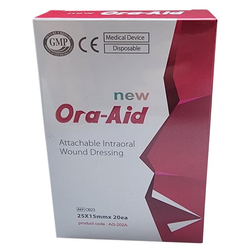 Ora-Aid 15mm x 25mm Intra-Oral Wound Dressing. Intended for the management of all types of oral wound injuries and ulcerations of the gingival and oral mucosa including: stomatitis, minor chafing, traumatic ulcers, abrasions caused by braces, ill-fitting dentures, and lesions associated with oral surgery. It is easy to use, just peel off and stick on the wound site!