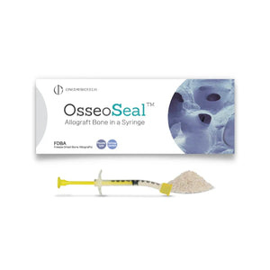 OsseoSeal bone in syringe is a mixture of allograft mineralized cortical and cancellous powder in a convenient syringe with a filter cap! Curved syringe for better access to site. The cancellous and cortical blend forms an osteoconductive scaffold providing volume enhancement and effective site development for successful dental implant placement.