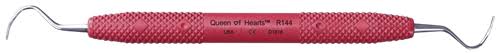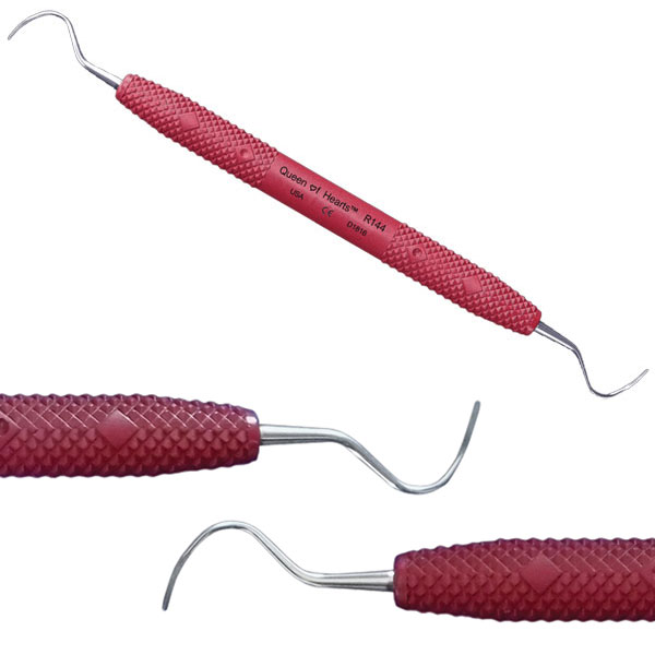 The PDT Queen of Hearts™ is a universal periodontal curette that has longer closed-face cutting edges capable of reaching furcations and difficult-to-reach root concavities. Due to the angulation, the patient does not have to open their mouth as wide, you can easily reach the distal of the molars and come around the line angle as well as use this universal perio curette throughout the mouth. When properly adapted the handle extends out of the mouth increasing patient comfort. The two 6mm cutting edges slides easily into deep pockets when you lead with the toe, like a probe, and then perform horizontal and oblique strokes. The Queen of Hearts™ is a great addition to any adult maintenance or perio kit to maximize efficiency. PDT donates a percentage of every Queen of Hearts™ purchase to the American Heart Association.
