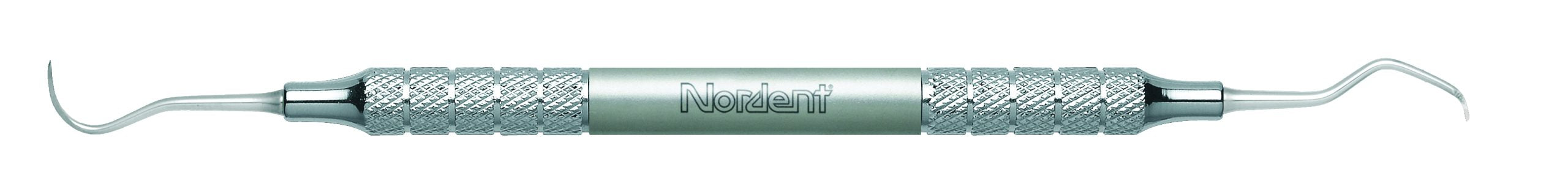 Combines the moderate size, medium-reach N5 sickle that has a blade width of 0.9 mm that tapers to a point with a small contra-angle hoe that has a blade width of 2 mm for anterior lingual surfaces. For routine use. Featuring our Relyant® Handle, additional handle options are shown below.